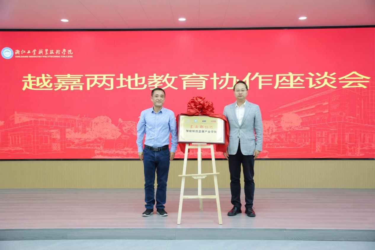 会上举行了“智能制造蓝鹰产业学院”揭牌仪式。乐山职业技术学院党委副书记、工会主席张佳,浙江工业职业技术学院党委委员、副校长林克伟,参与揭牌。