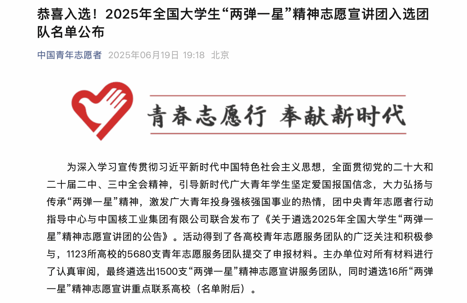 为深入学习宣传贯彻习近平新时代中国特色社会主义思想,全面贯彻党的二十大和二十届二中、三中全会精神,引导新时代广大青年学生坚定爱国报国信念,大力弘扬与传承“两弹一星”精神,激发广大青年投身强核强国事业的热情,团中央青年志愿者行动指导中心与中国核工业集团有限公司联合发布了《关于遴选2025年全国大学生“两弹一星”精神志愿宣讲团的公告》。