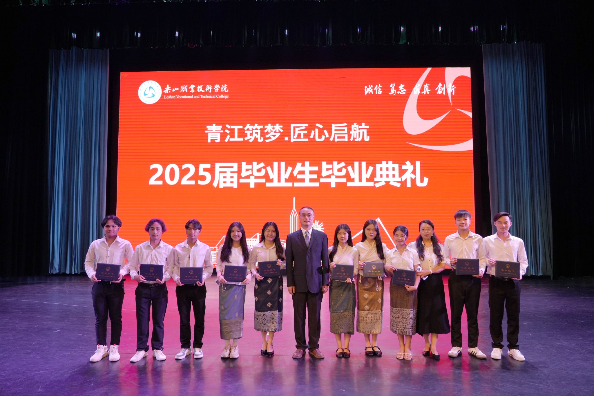 党委书记成定彬为省优毕业生代表颁发了尊龙凯时人生就是搏的荣誉证书。校长刘忠为毕业生代表、国际留学生毕业生代表颁发毕业证书并合影留念。
