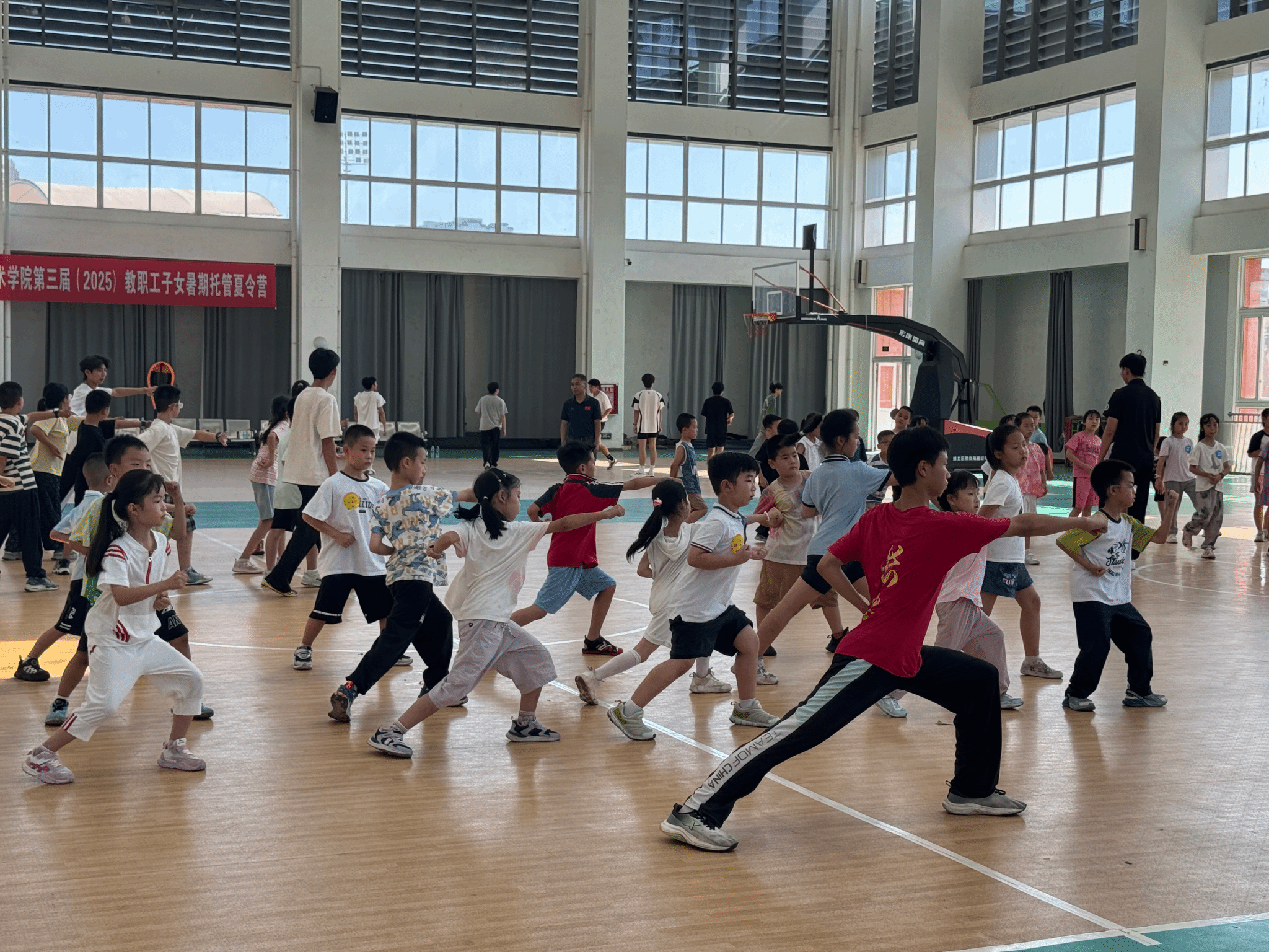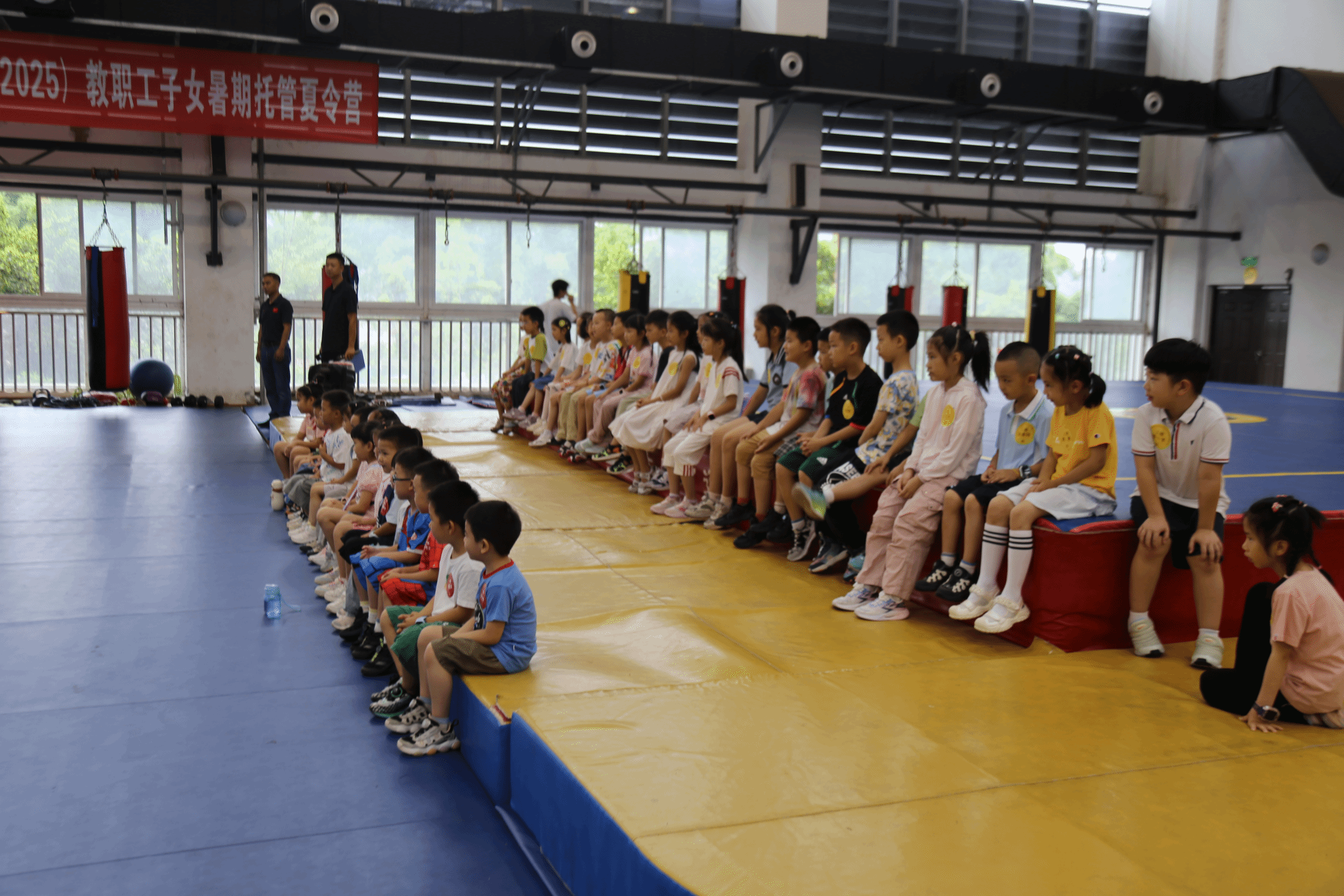 6月30日上午,在乐山职业技术学院体育馆二楼青江武术散打训练基地,在嘹亮的国歌声和精彩的武术展演活动中开启了我校第三届教职工子女暑期爱心托管夏令营。100余名教职工子女及其家长参加了开营仪式。