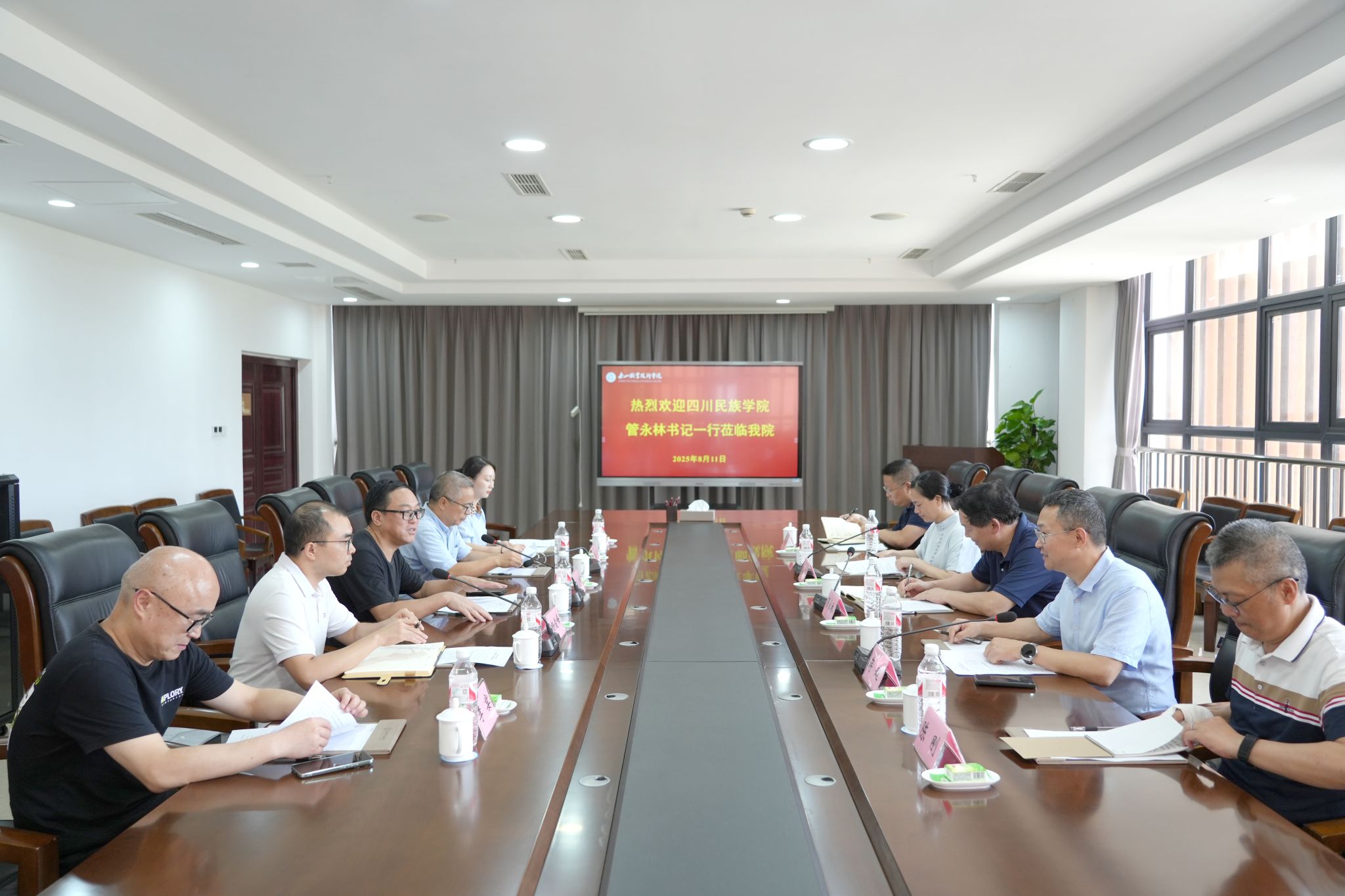2025年8月11日,四川民族学院党委书记管永林一行莅临我校,围绕新校园建设工作开展专题学习交流。党委书记成定彬,党委委员、副校长张学河及相关部门负责人陪同交流。