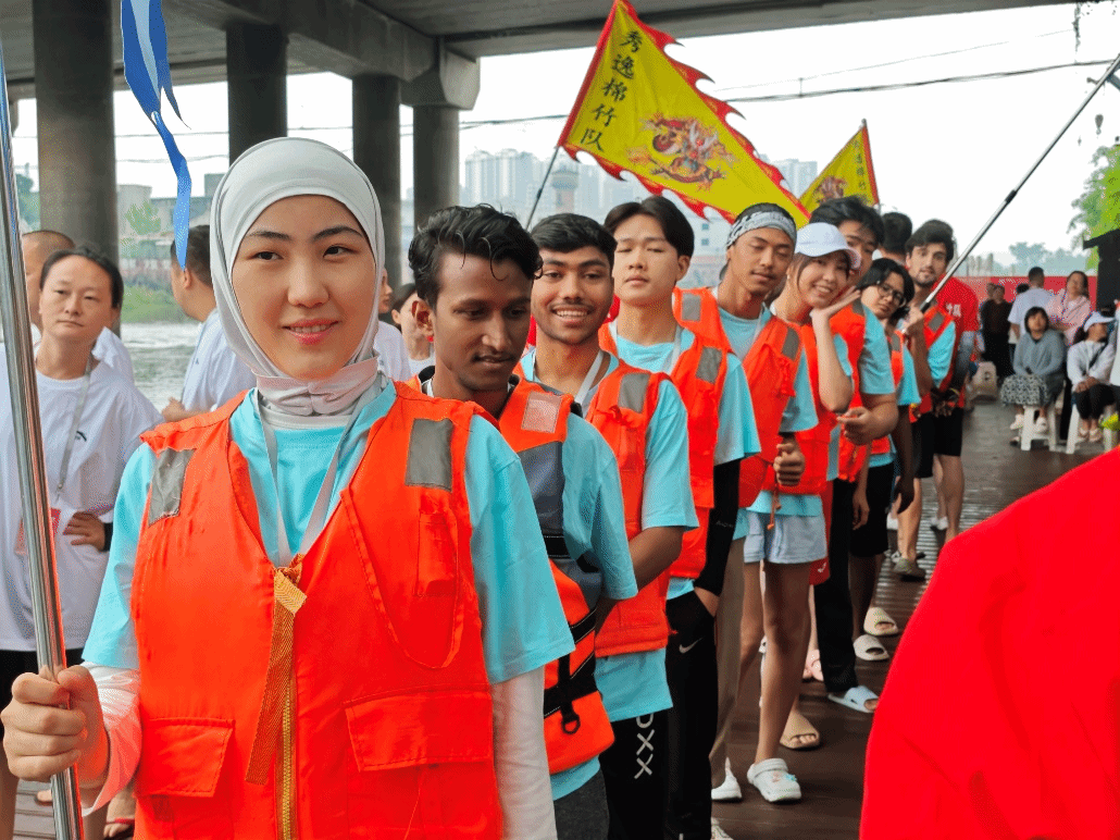 比赛当日,留学生们与来自市中区的20支代表队伍同场挥桨。鼓点激越,船桨翻飞,碧波之上龙舟齐发。留学生们全情投入,奋力协作,在观众的呐喊助威中完成了全程比赛,真切融入了这场以欢乐和体验为核心的水上盛会。