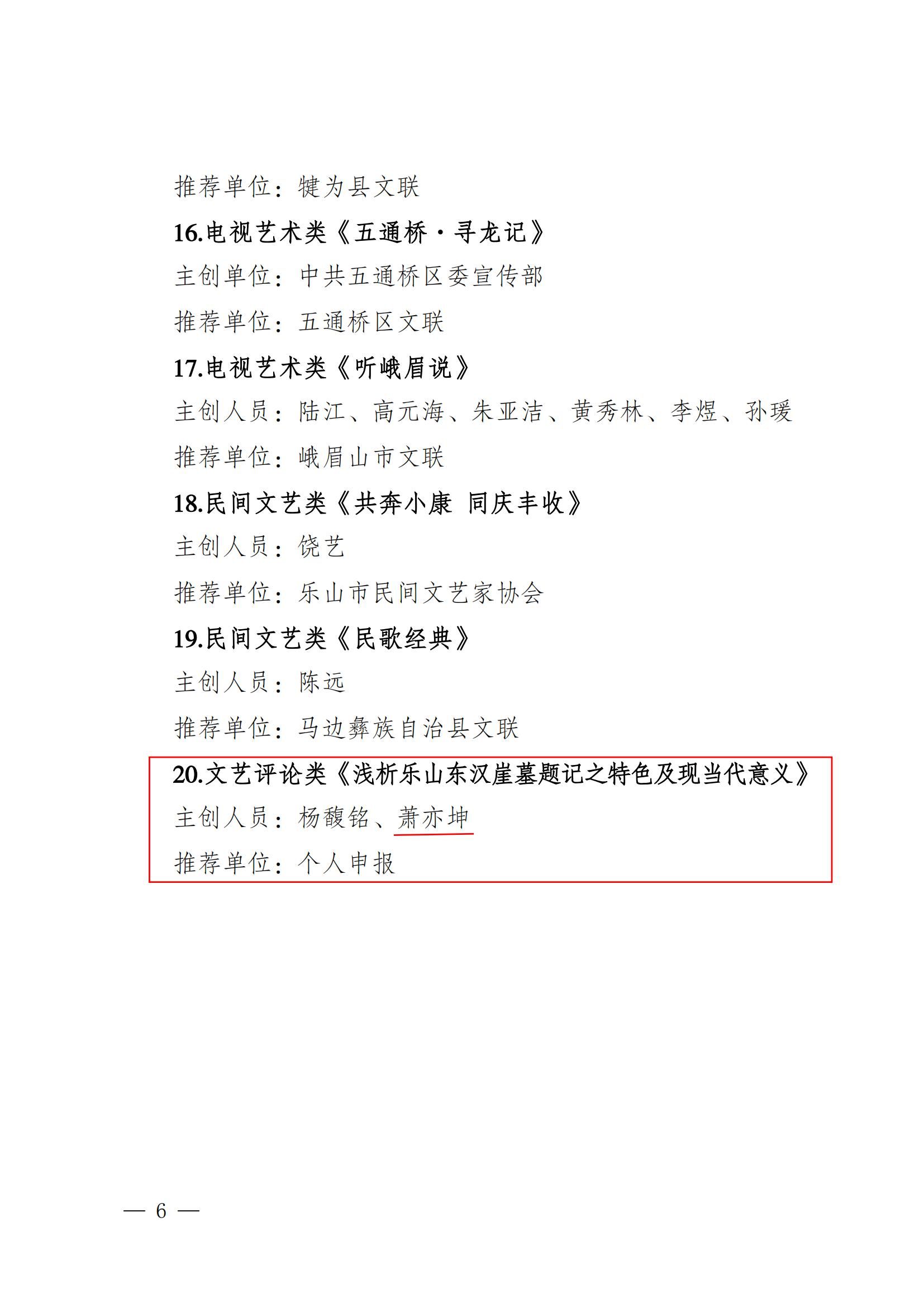今年 2 月,乐山市文联启动了 2024 年度“20 佳推优”工程申报评选工作,经初审、终审,并结合公示收集到的意见建议,市文联主席团研究决定,评选出“特别项”作品 7 件、“入选项”作品 20 件,组织工作突出单位 10 个。乐山职业技术学院素质教育学院美育教研室教师萧亦坤的文艺评论《浅析乐山东汉崖墓题记之特色及现当代意义》入选2024 年度“20 佳推优”工程“入选项”。