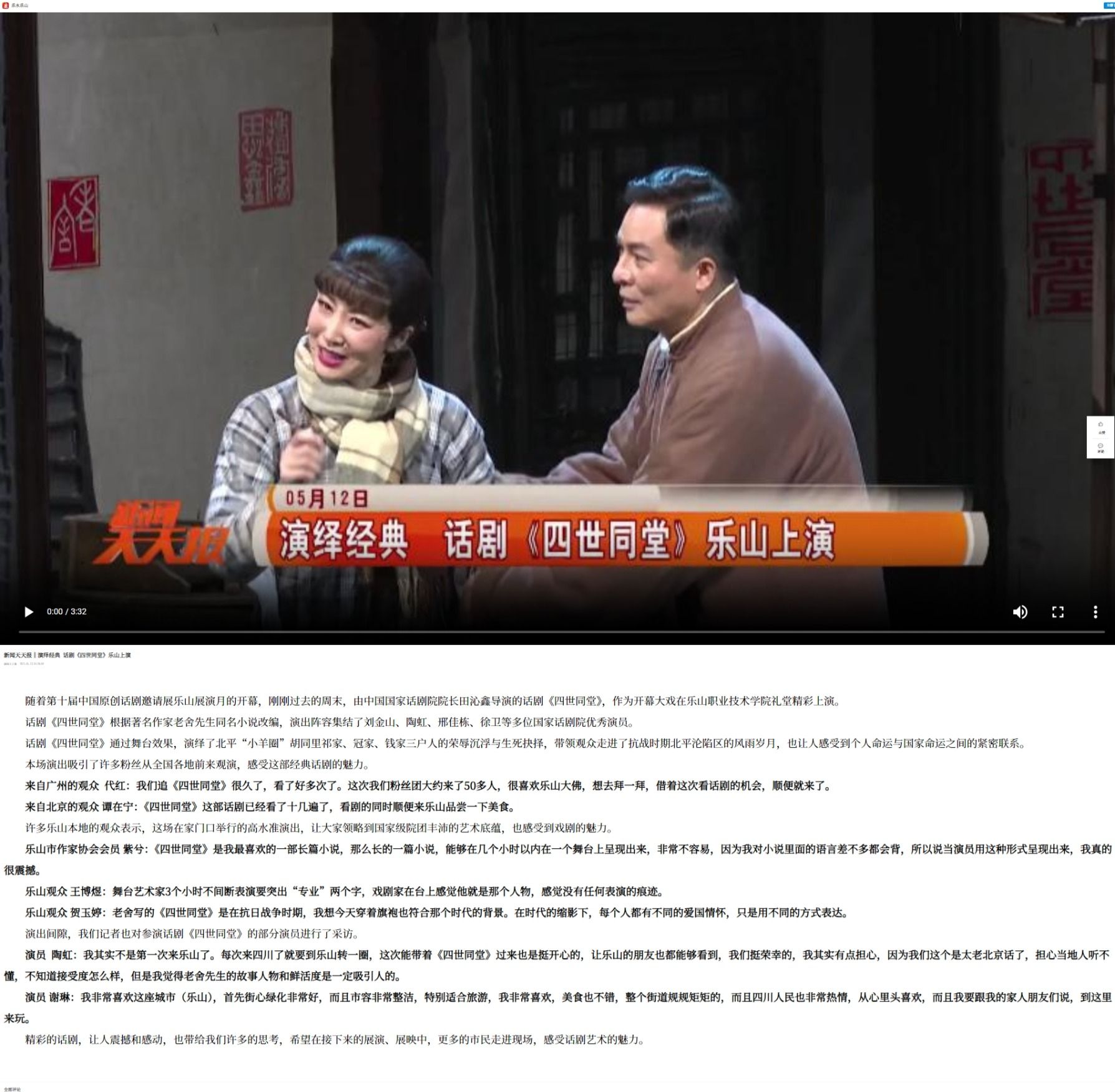 乐山电视台新闻联播:第十届中国原创话剧邀请展乐山展演月开幕式暨《四世同堂》展演活动举行(视频)
